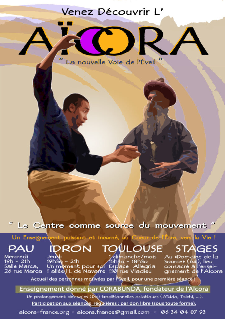 Relâchement, vitalité, centrage, puissance, bienveillance, par la connexion de Centre à Centre. L’Aïcora est une nouvelle pratique d’Éveil (libération de l’égo), en prolongement des voies (Do) traditionnelles asiatiques (Aïkido, Taichi, …).
